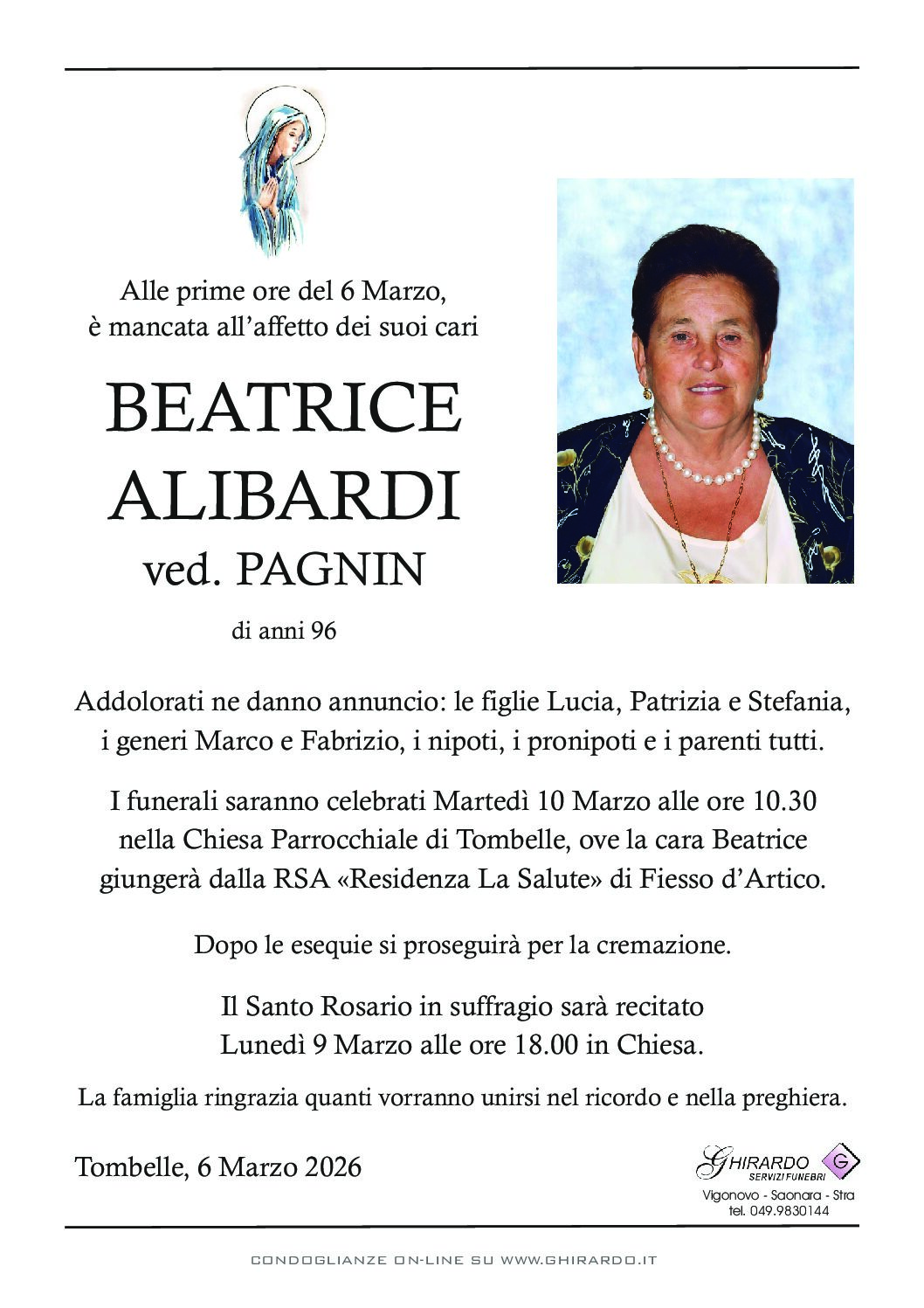 I funerali saranno celebrati Martedì 10 Marzo alle ore 10.30 nella Chiesa Parrocchiale di Tombelle, ove la cara Beatrice giungerà dalla RSA «Residenza La Salute» di Fiesso d’Artico.