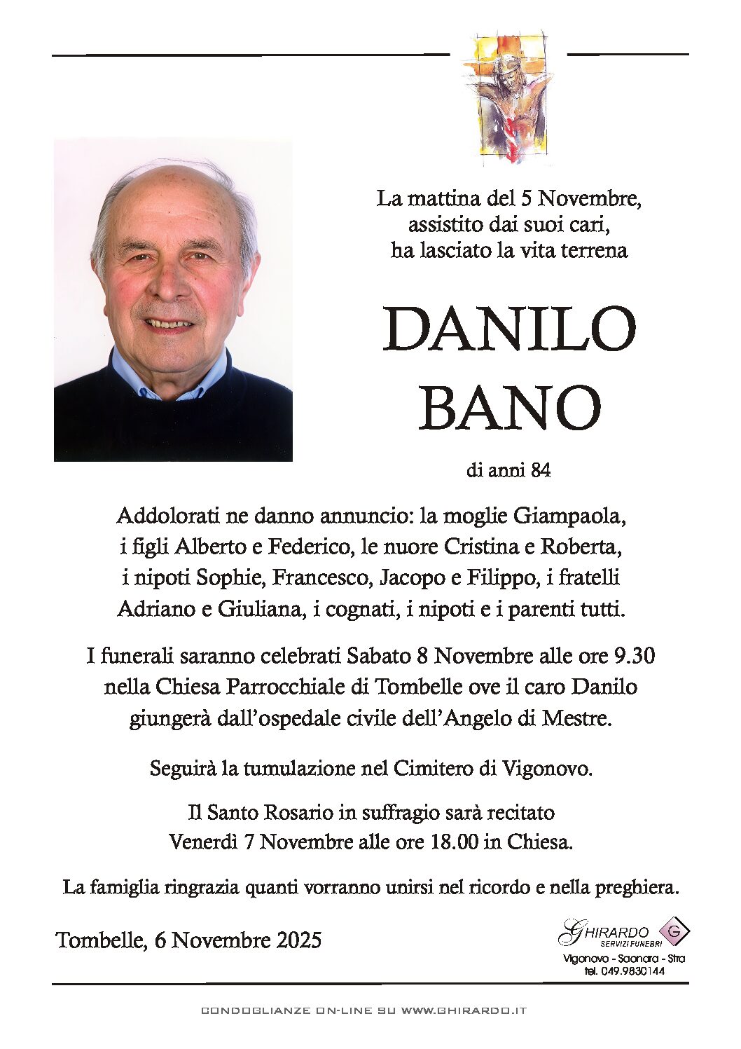 I funerali saranno celebrati Sabato 8 Novembre alle ore 9.30 nella Chiesa Parrocchiale di Tombelle ove il caro Danilo giungerà dall’ospedale civile dell’Angelo di Mestre.