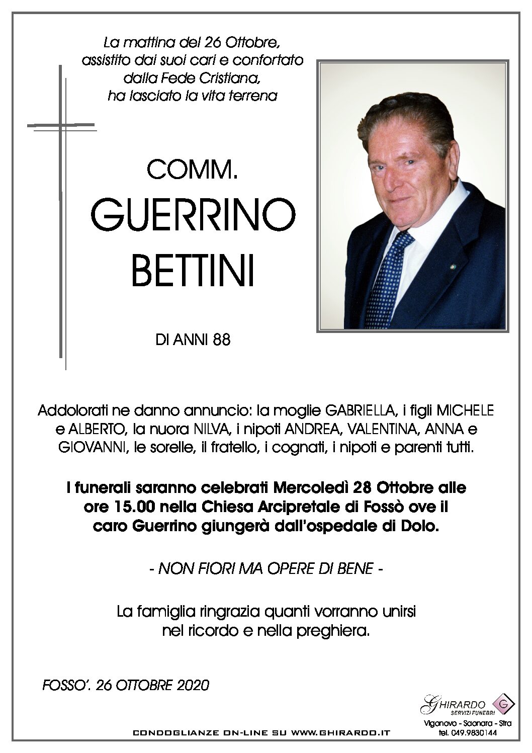 I funerali saranno celebrati Mercoledì 28 Ottobre alle ore 15.00 nella Chiesa Arcipretale di Fossò ove il caro Guerrino giungerà dall’ospedale di Dolo.