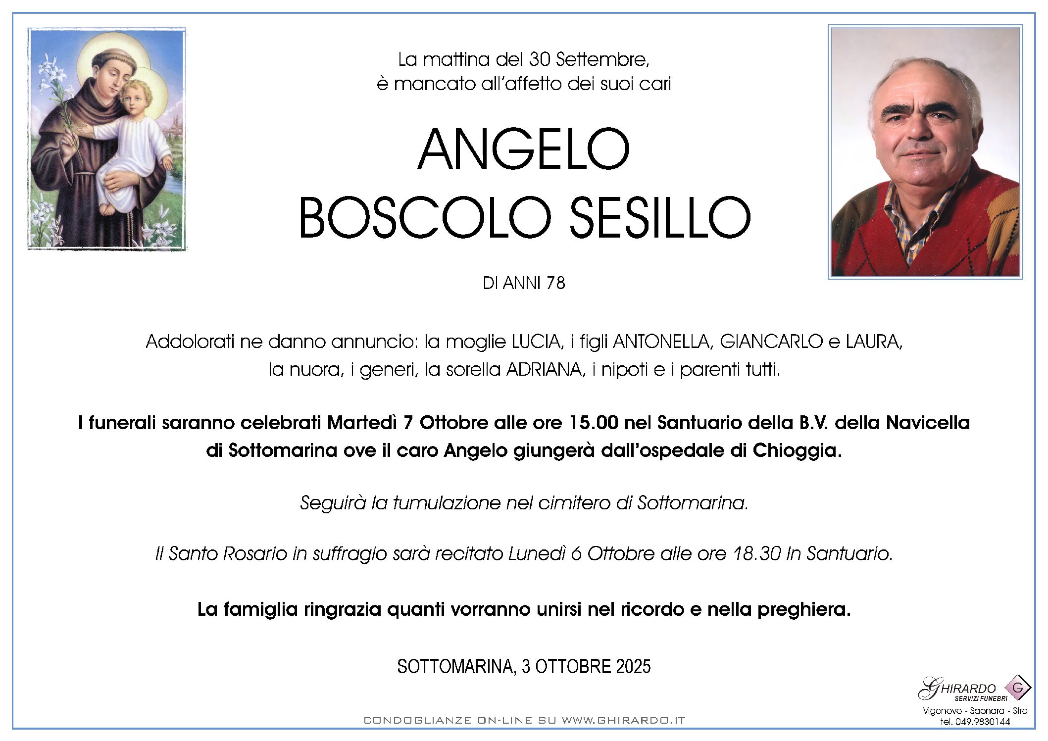 I funerali saranno celebrati Martedì 7 Ottobre alle ore 15.00 nel Santuario della B.V. della Navicella di Sottomarina ove il caro Angelo giungerà dall’ospedale di Chioggia.