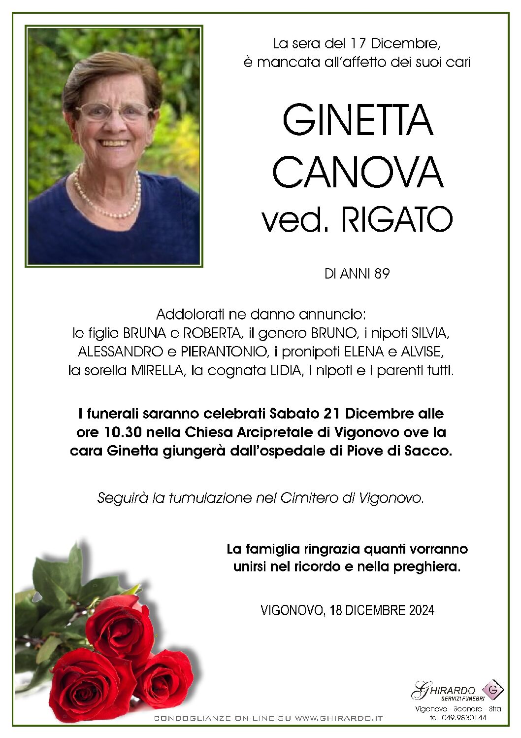 I funerali saranno celebrati Sabato 21 Dicembre alle ore 10.30 nella Chiesa Arcipretale di Vigonovo ove la cara Ginetta giungerà dall’ospedale di Piove di Sacco.