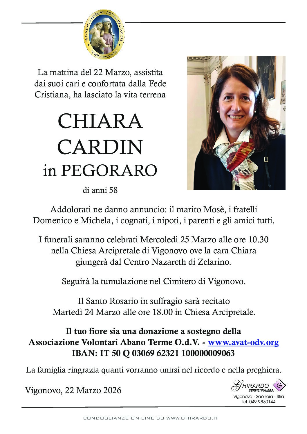 I funerali saranno celebrati Mercoledì 25 Marzo alle ore 10.30 nella Chiesa Arcipretale di Vigonovo ove la cara Chiara giungerà dal Centro Nazareth di Zelarino.
