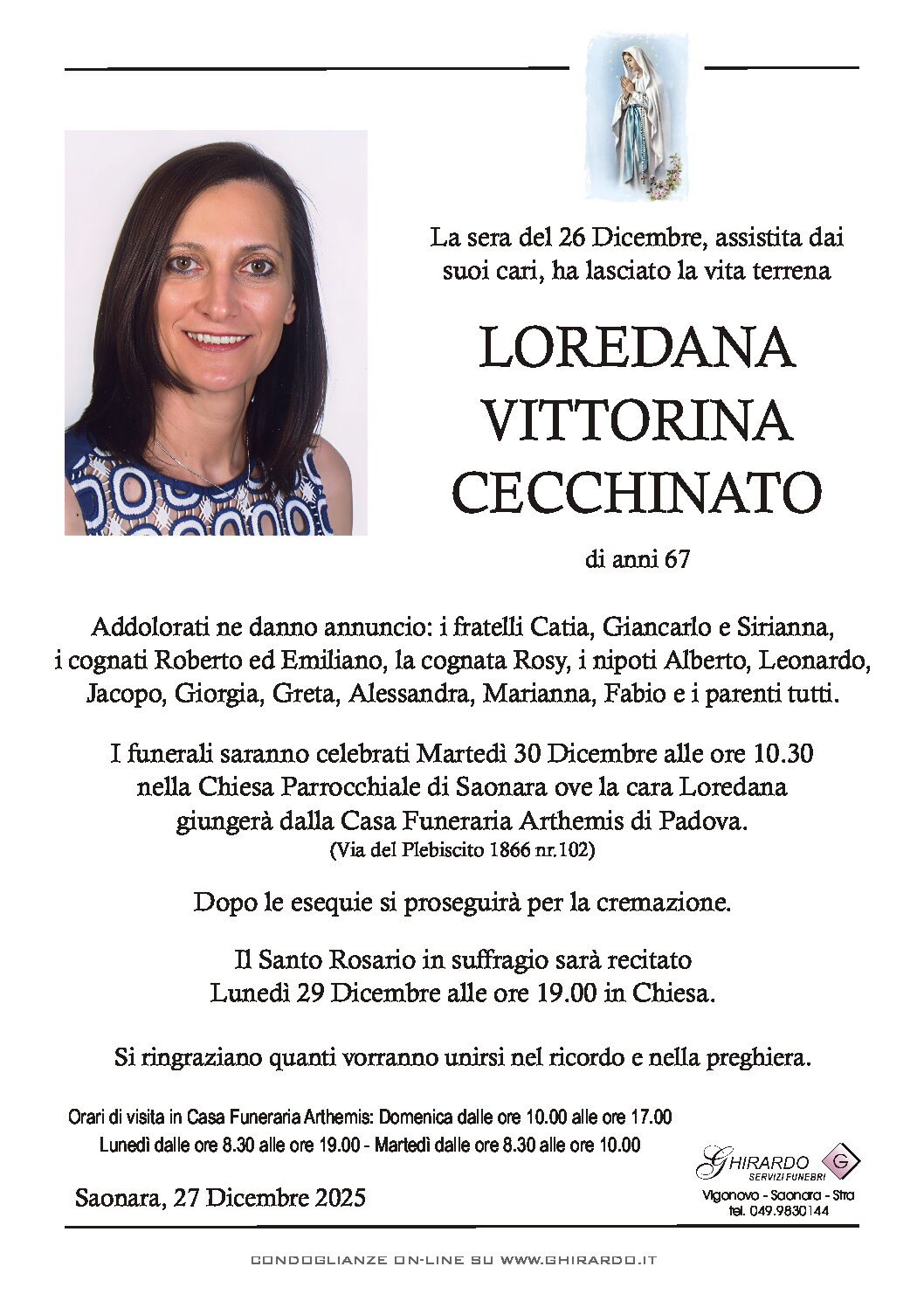 I funerali saranno celebrati Martedì 30 Dicembre alle ore 10.30 nella Chiesa Parrocchiale di Saonara ove la cara Loredana giungerà dalla Casa Funeraria Arthemis di Padova (Via del Plebiscito 1866 nr.102).