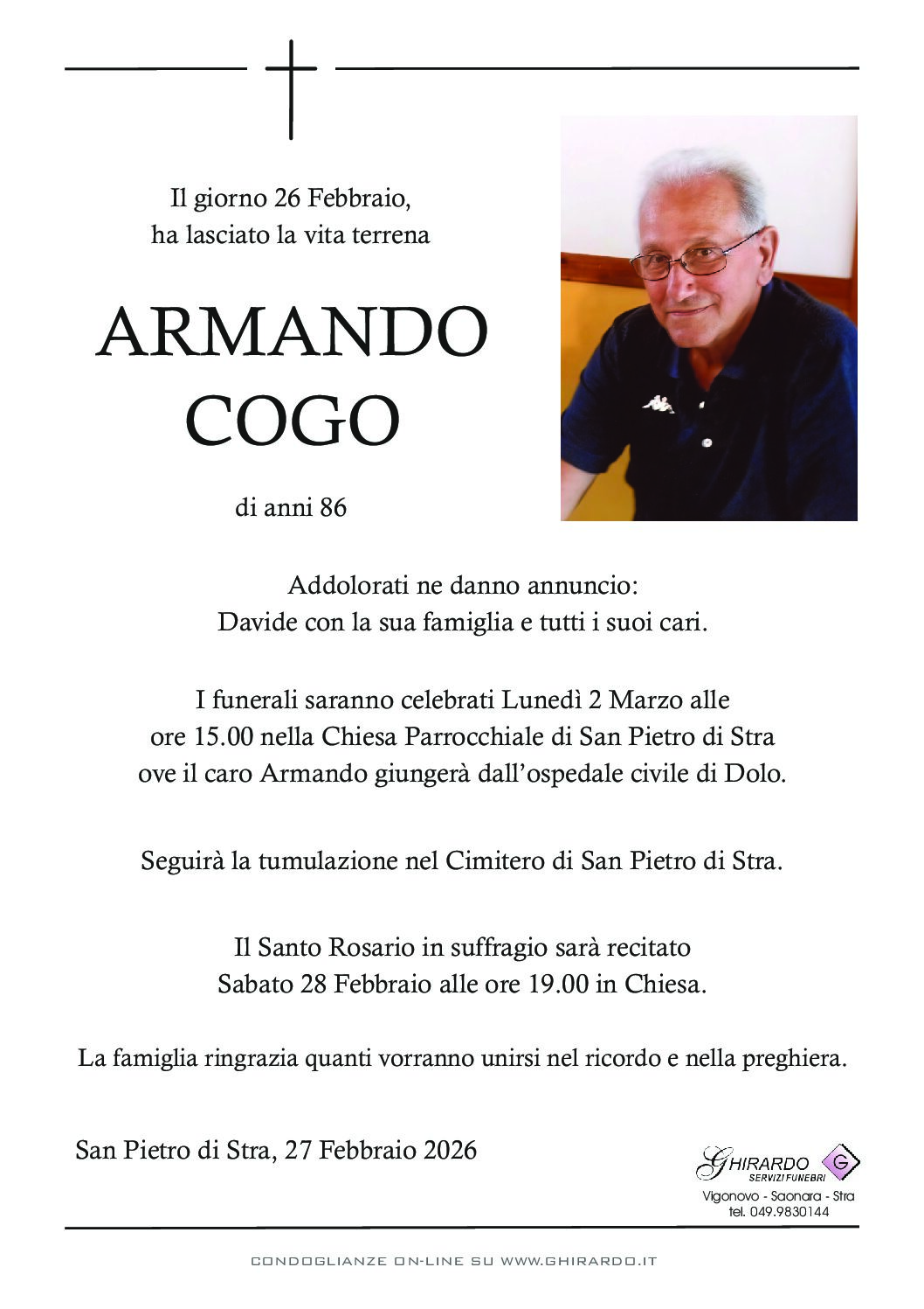 I funerali saranno celebrati Lunedì 2 Marzo alle ore 15.00 nella Chiesa Parrocchiale di San Pietro di Stra ove il caro Armando giungerà dall’ospedale civile di Dolo.
