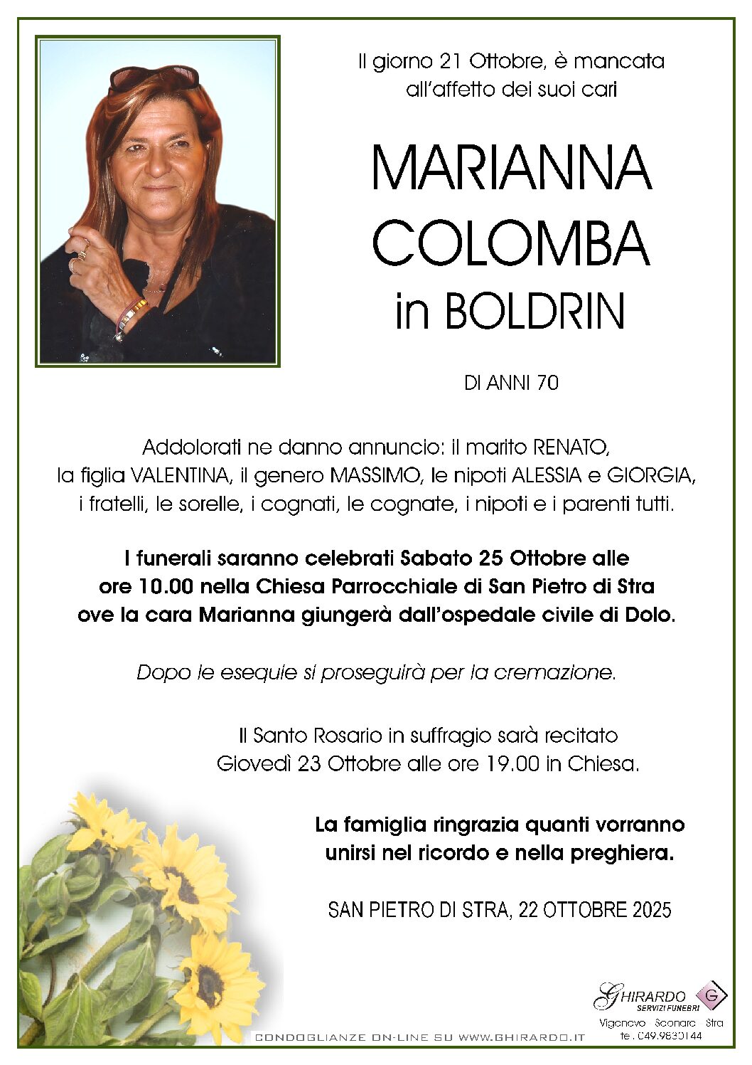 I funerali saranno celebrati Sabato 25 Ottobre alle ore 10.00 nella Chiesa Parrocchiale di San Pietro di Stra ove la cara Marianna giungerà dall’ospedale civile di Dolo.