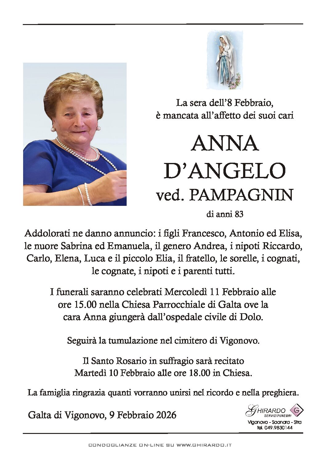 I funerali saranno celebrati Mercoledì 11 Febbraio alle ore 15.00 nella Chiesa Parrocchiale di Galta ove la cara Anna giungerà dall’ospedale civile di Dolo.