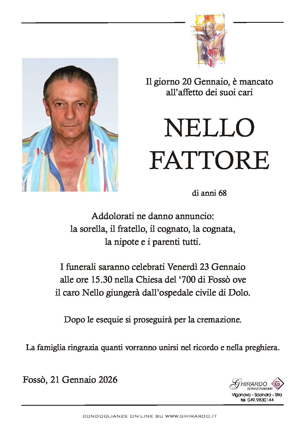 I funerali saranno celebrati Venerdì 23 Gennaio alle ore 15.30 nella Chiesa del ‘700 di Fossò ove il caro Nello giungerà dall’ospedale civile di Dolo.