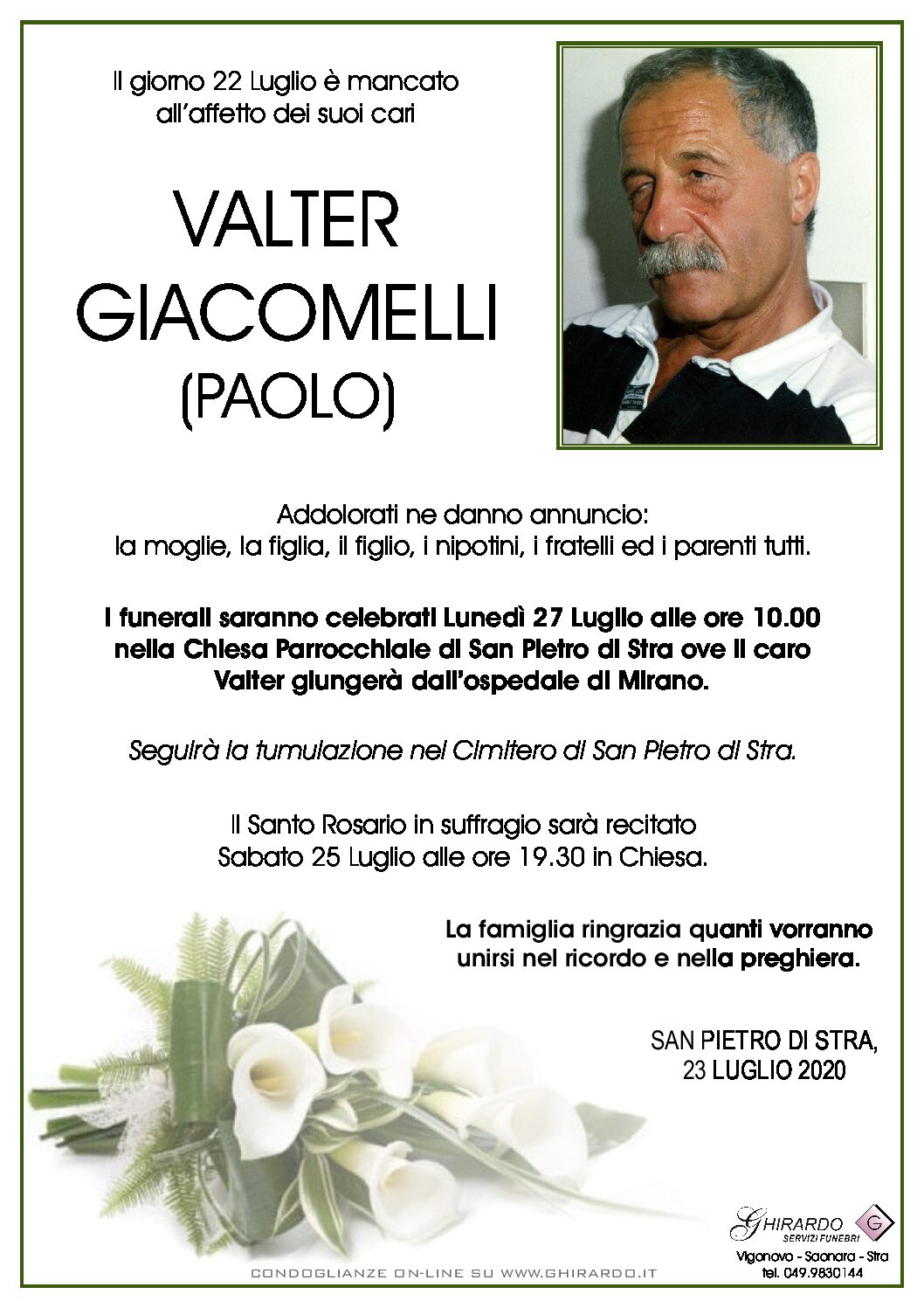 I funerali saranno celebrati Lunedì 27 Luglio alle ore 10.00 nella Chiesa Parrocchiale di San Pietro di Stra ove il caro Valter giungerà dall’ospedale di Mirano.