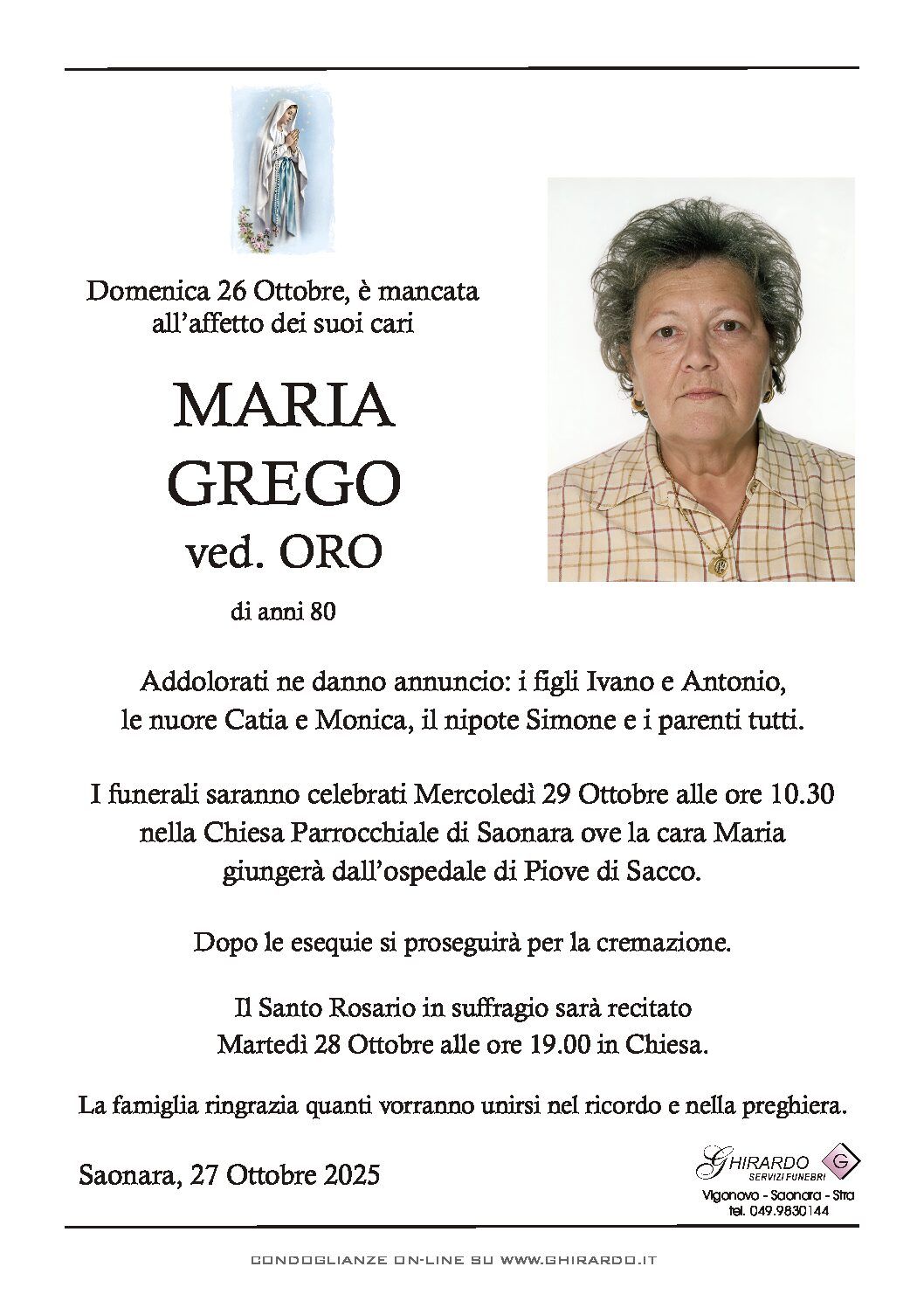 I funerali saranno celebrati Mercoledì 29 Ottobre alle ore 10.30 nella Chiesa Parrocchiale di Saonara ove la cara Maria giungerà dall’ospedale di Piove di Sacco.