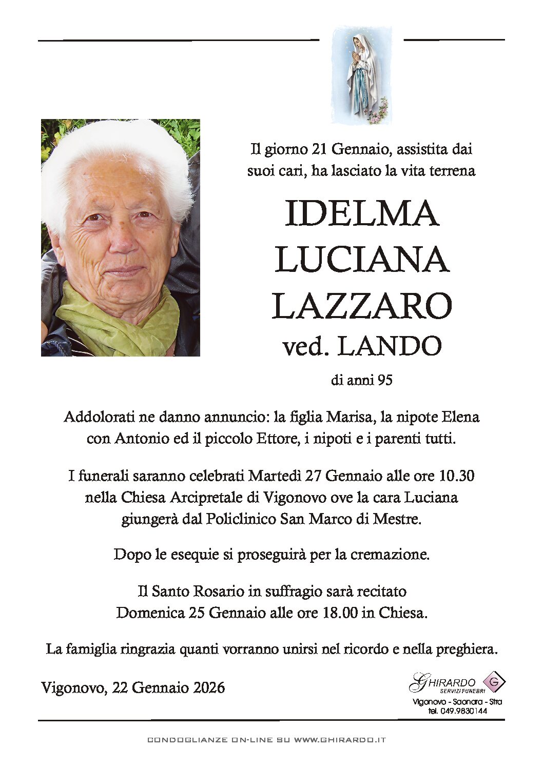 I funerali saranno celebrati Martedì 27 Gennaio alle ore 10.30 nella Chiesa Arcipretale di Vigonovo ove la cara Luciana giungerà dal Policlinico San Marco di Mestre.