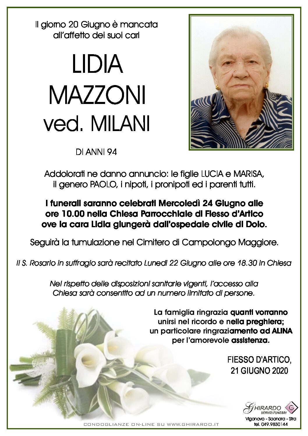 I funerali saranno celebrati Mercoledì 24 Giugno alle ore 10.00 nella Chiesa Parrocchiale di Fiesso d’Artico ove la cara Lidia giungerà dall’ospedale civile di Dolo.