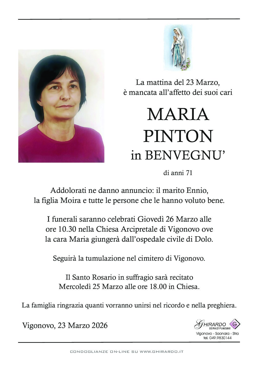 I funerali saranno celebrati Giovedì 26 Marzo alle ore 10.30 nella Chiesa Arcipretale di Vigonovo ove la cara Maria giungerà dall’ospedale civile di Dolo.