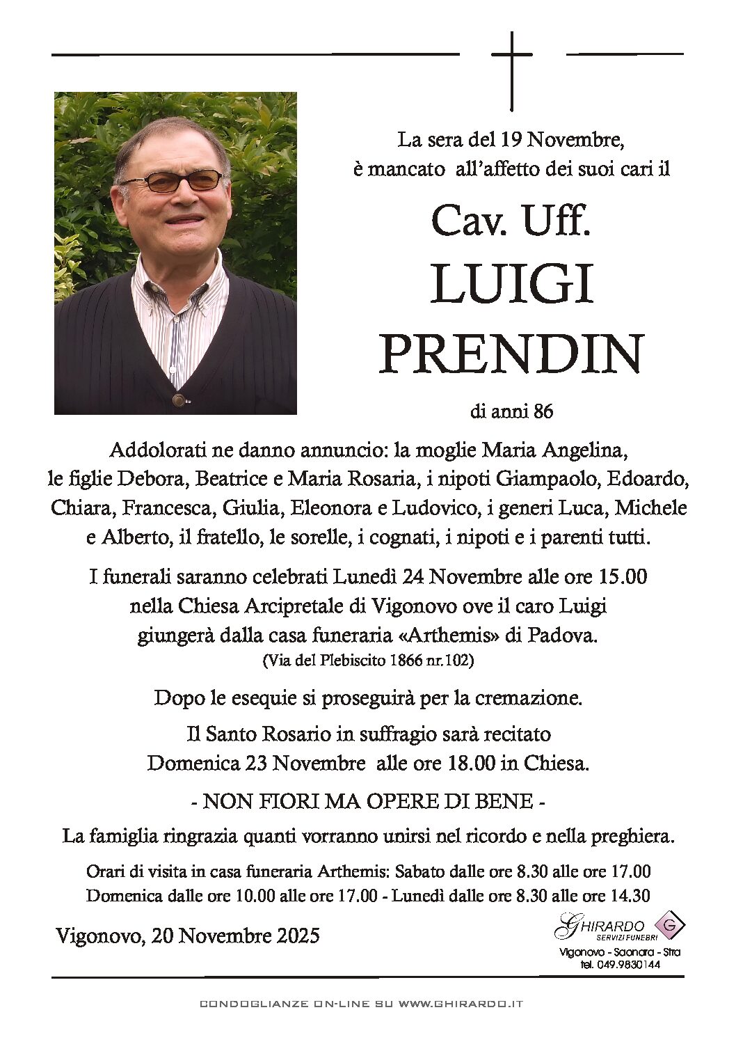 I funerali saranno celebrati Lunedì 24 Novembre alle ore 15.00 nella Chiesa Arcipretale di Vigonovo ove il caro Luigi giungerà dalla casa funeraria «Arthemis» di Padova (Via del Plebiscito 1866 nr.102).