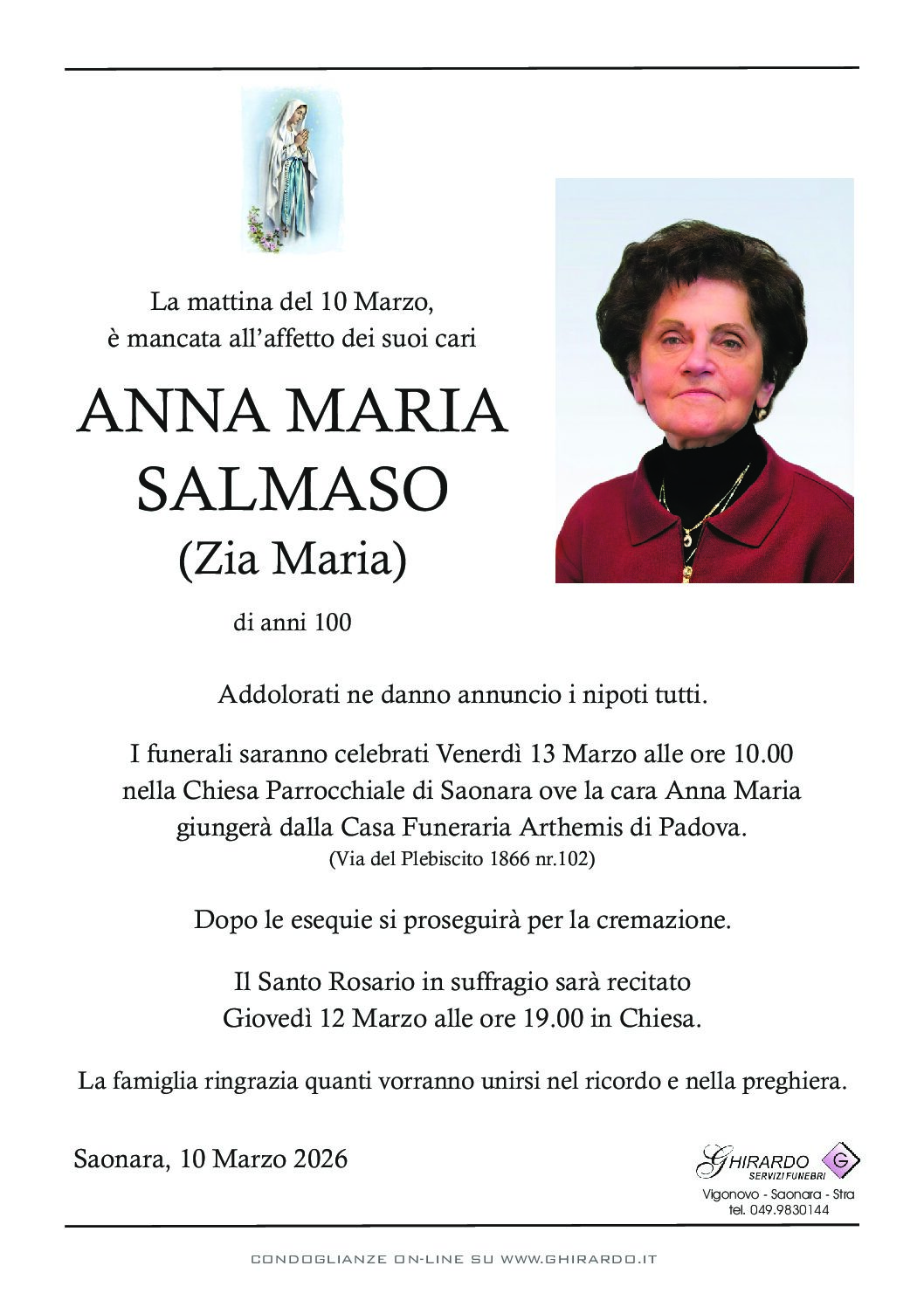 I funerali saranno celebrati Venerdì 13 Marzo alle ore 10.00 nella Chiesa Parrocchiale di Saonara ove la cara Anna Maria giungerà dalla Casa Funeraria Arthemis di Padova (Via del Plebiscito 1866 nr.102).