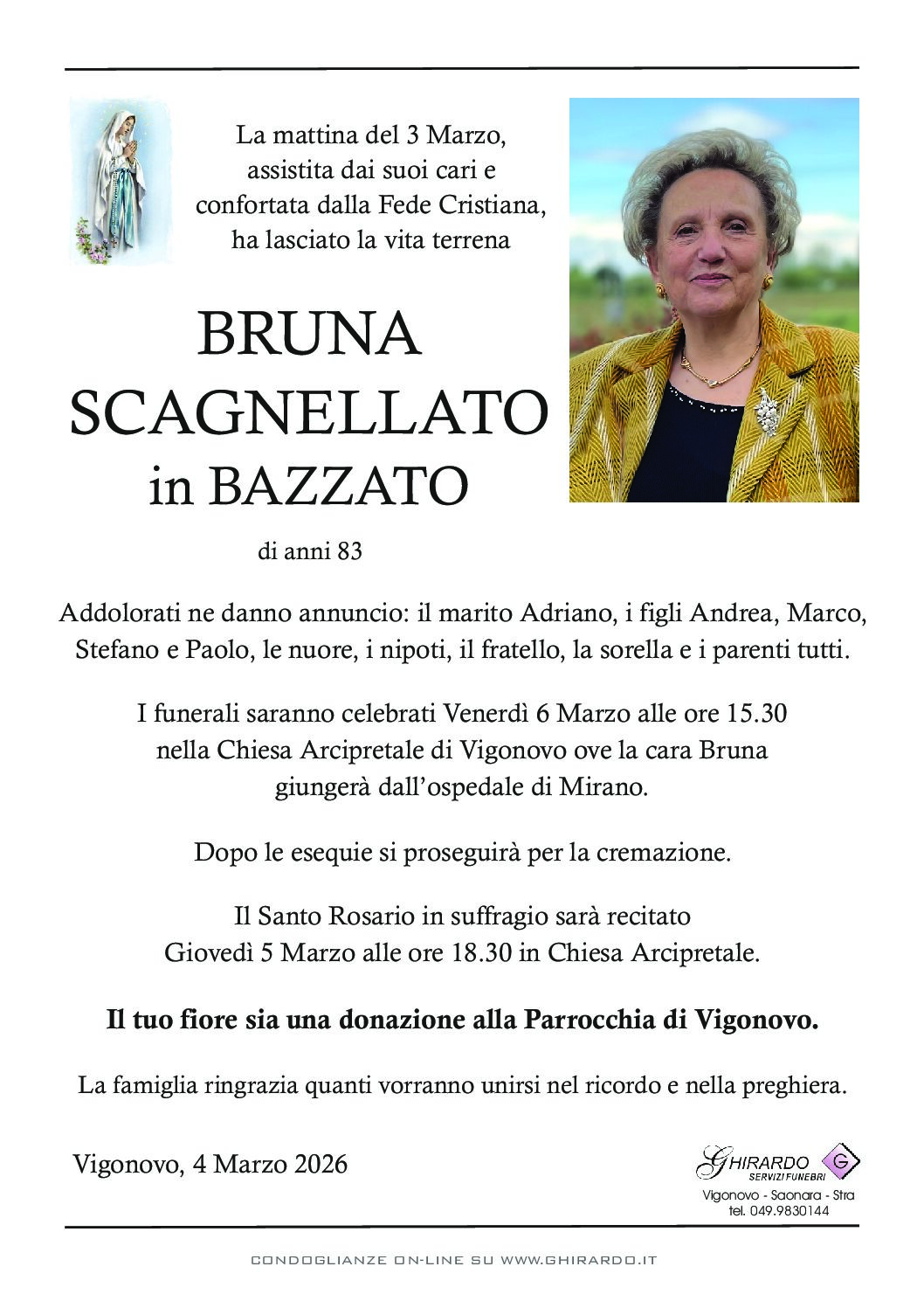 I funerali saranno celebrati Venerdì 6 Marzo alle ore 15.30 nella Chiesa Arcipretale di Vigonovo ove la cara Bruna giungerà dall’ospedale di Mirano.