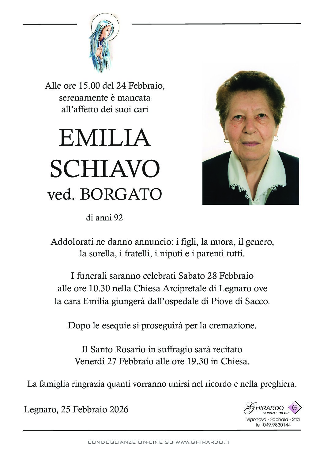 I funerali saranno celebrati Sabato 28 Febbraio alle ore 10.30 nella Chiesa Arcipretale di Legnaro ove la cara Emilia giungerà dall’ospedale di Piove di Sacco.